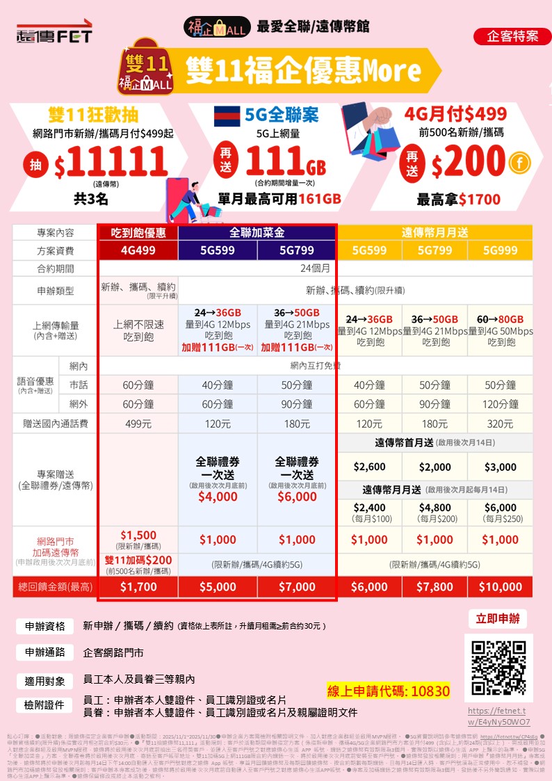 (三)599全聯禮卷_贈送4,000全聯禮卷+1,000元遠傳幣 「雙11加碼 贈送一次性111G 流量」限新辦/攜碼/續約(限升轉),續約遠傳幣加碼限4G升5G